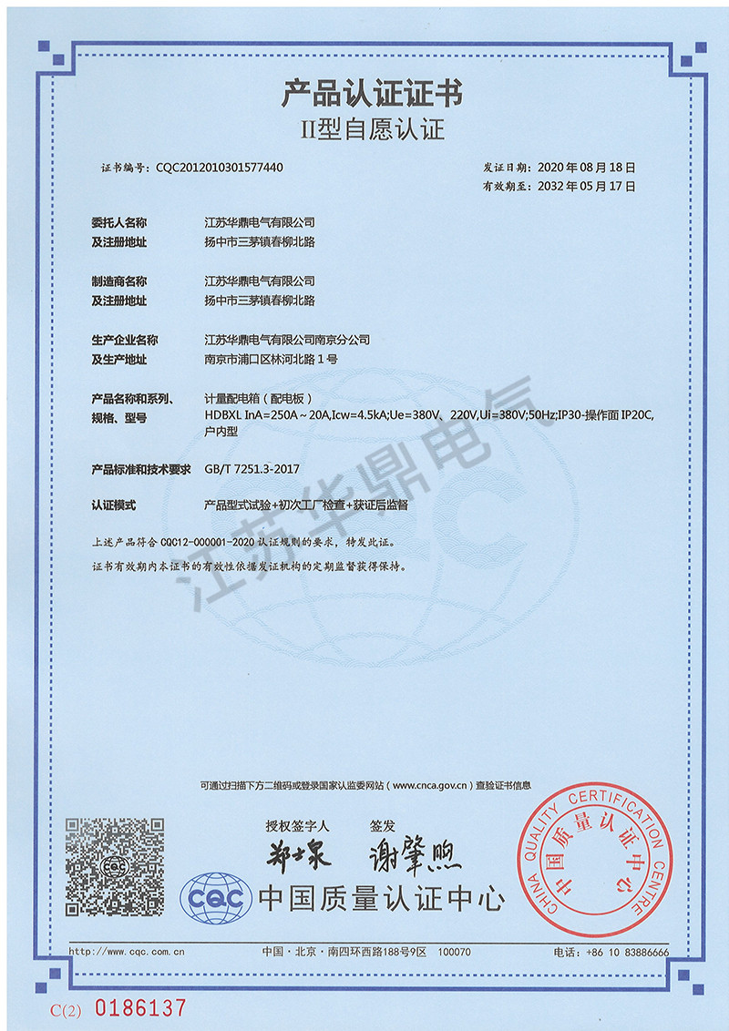 计量配电箱(配电板)产品认证书